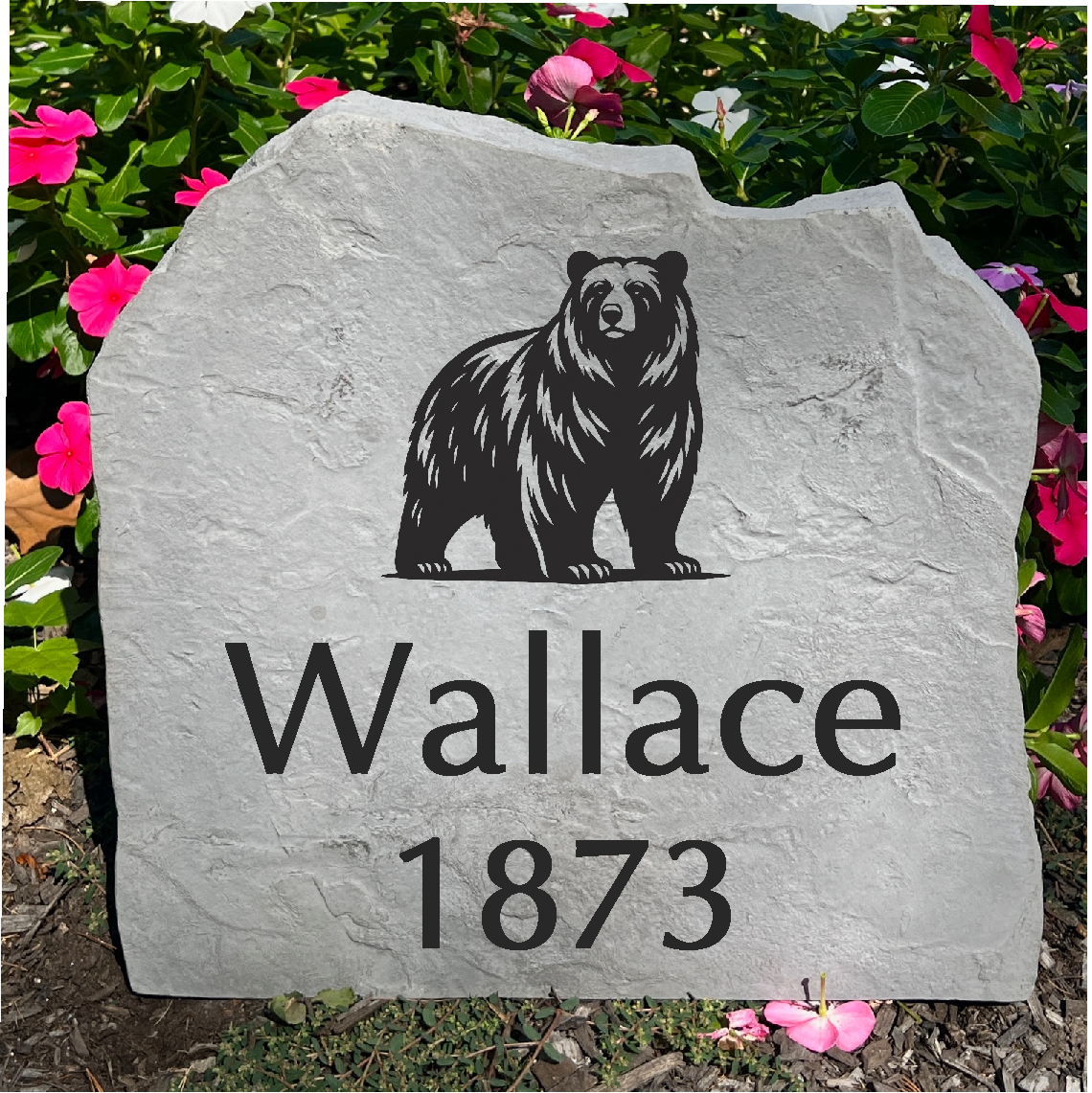 Each bear garden stone is crafted from a textured, natural-looking stone designed to blend seamlessly into outdoor environments while standing up to the elements. Your custom design is engraved directly into the surface of the stone, ensuring crisp detail that will not fade, peel, or wear away over time. Every stone is finished with a weatherproof sealant that protects against sun, rain, snow, and seasonal temperature changes. Built for durability, our landscape stones are guaranteed to last a lifetime.